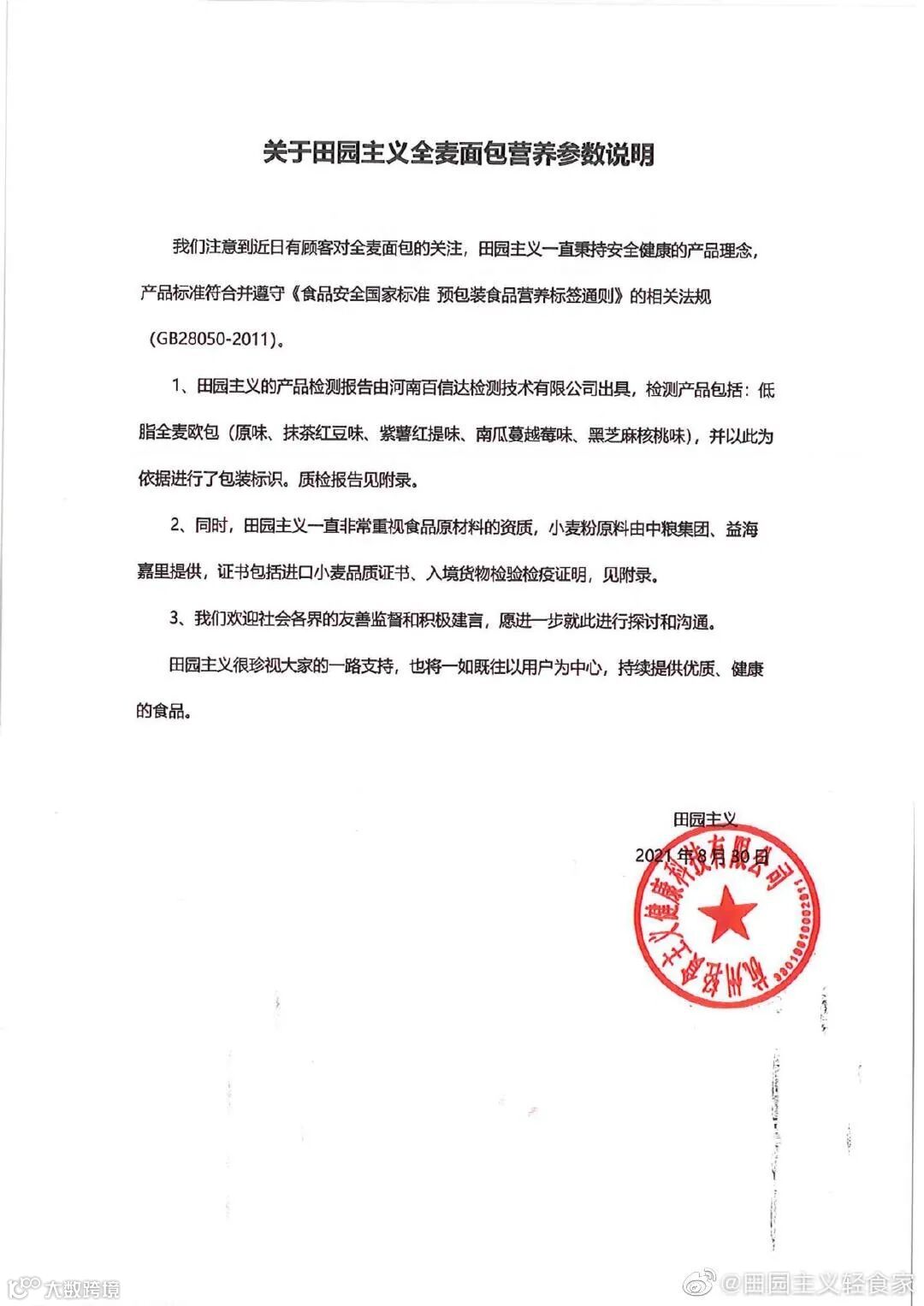 对此,田园主义晚间发文说明称,田园主义一直秉持安全健康的产品理念,产品标准符合并遵守国家相关法规。田园主义的产品检测报告由河南百信达检测技术有限公司出具,检测产品包括多种口味的低脂全麦欧包,并以此为依据进行了包装标识。