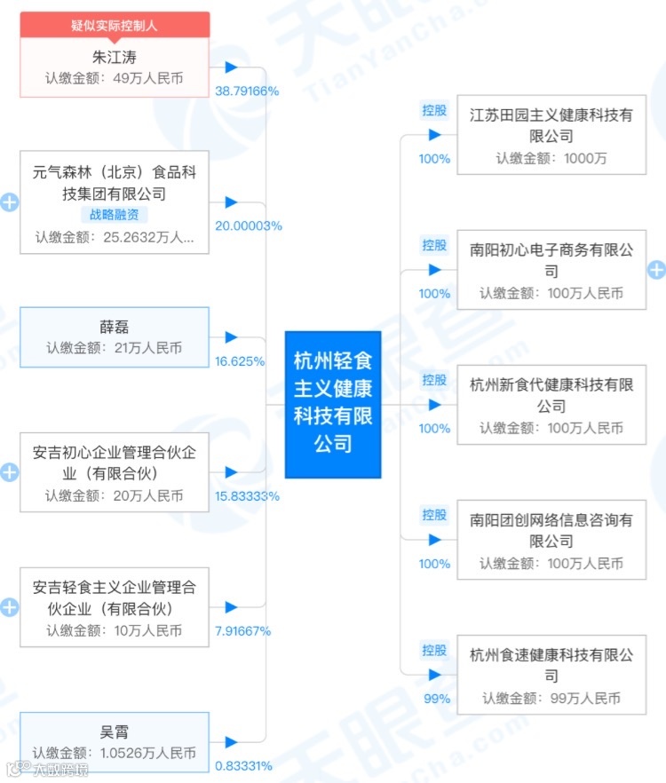 天眼查数据显示,田园主义背后的杭州轻食主义曾于去年12月获得元气森林的天使投资,元气森林目前持股20%。