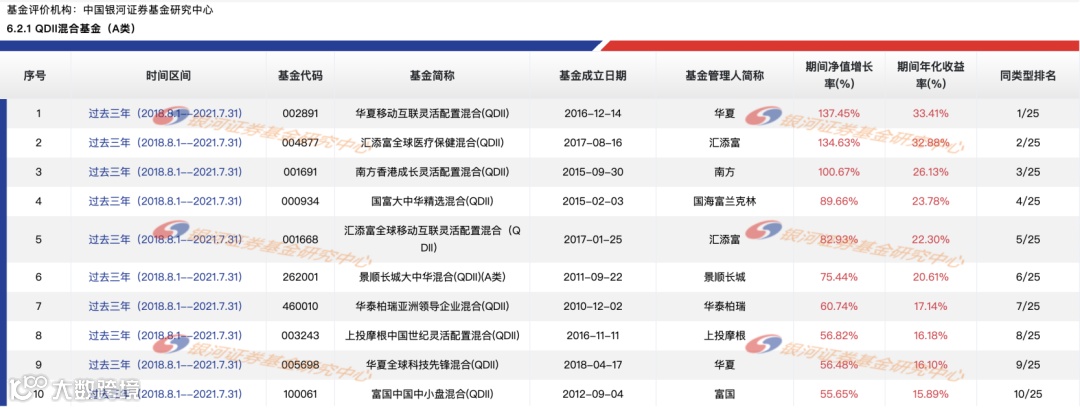 数据来源:中国银河证券基金研究中心官网公布的《中国公募基金长期业绩榜单》中QDII混合基金 (A类)过去三年业绩排名(2018.8.1-2021.7.31),数据截至2021年7月31日,参与排名的同类型基金共25只。