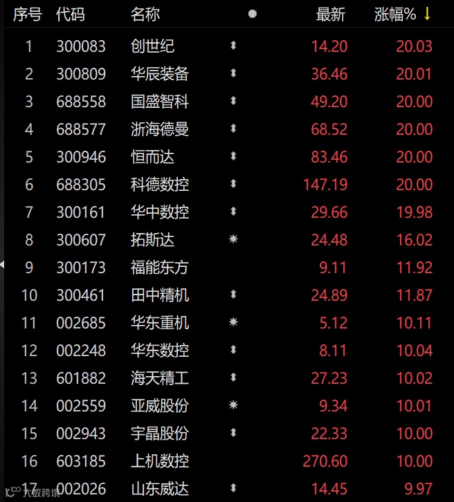 8月23日,工业母机板块满屏涨停,25只概念股成交额合计141亿元,较上一个交易日高40亿元,板块总市值增加280亿元至2791亿元。其中,创世纪、华辰装备、国盛智科、浙海德曼、恒而达、科德数控、华中数控上演“20cm”涨停。
