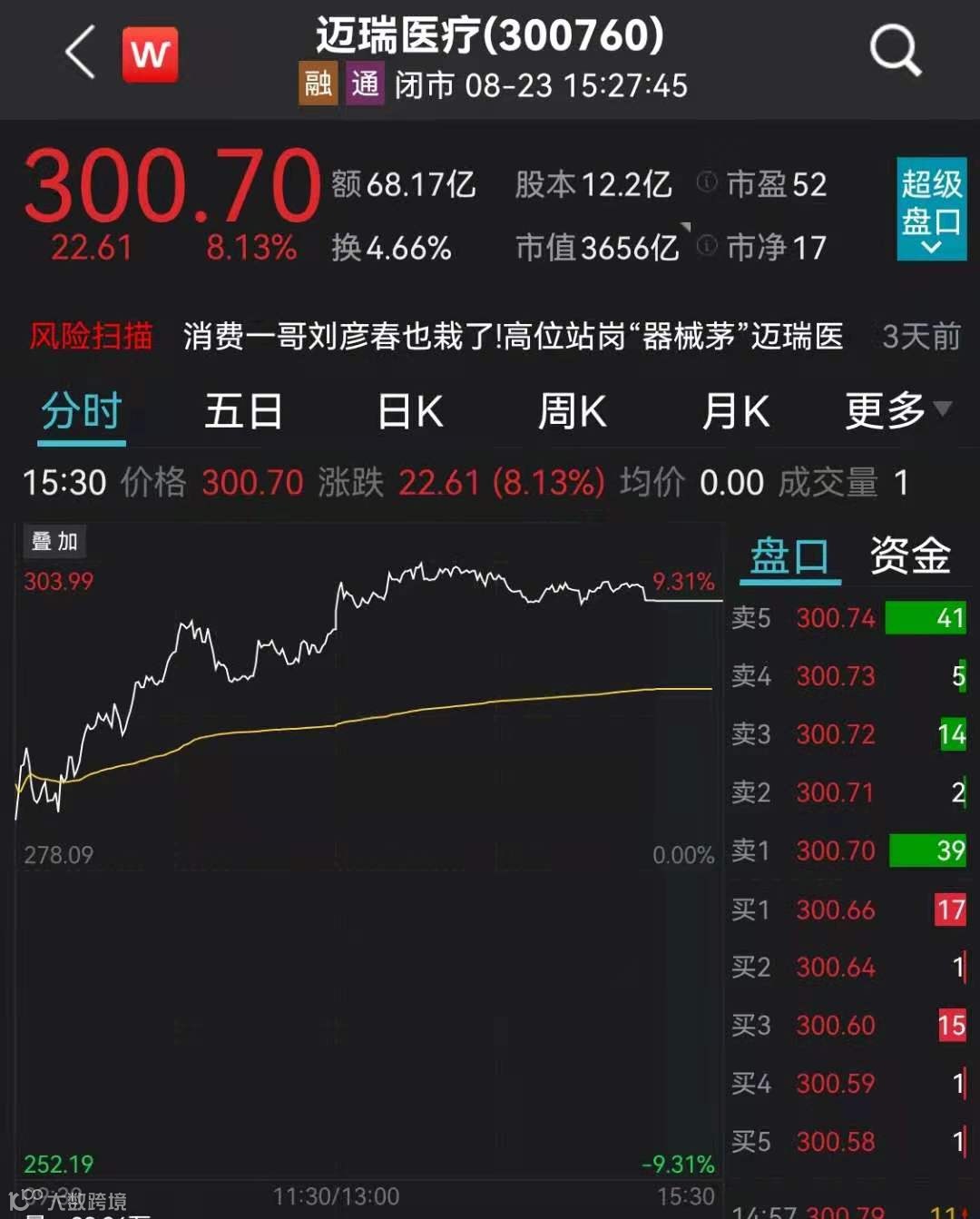 迈瑞医疗收复300元