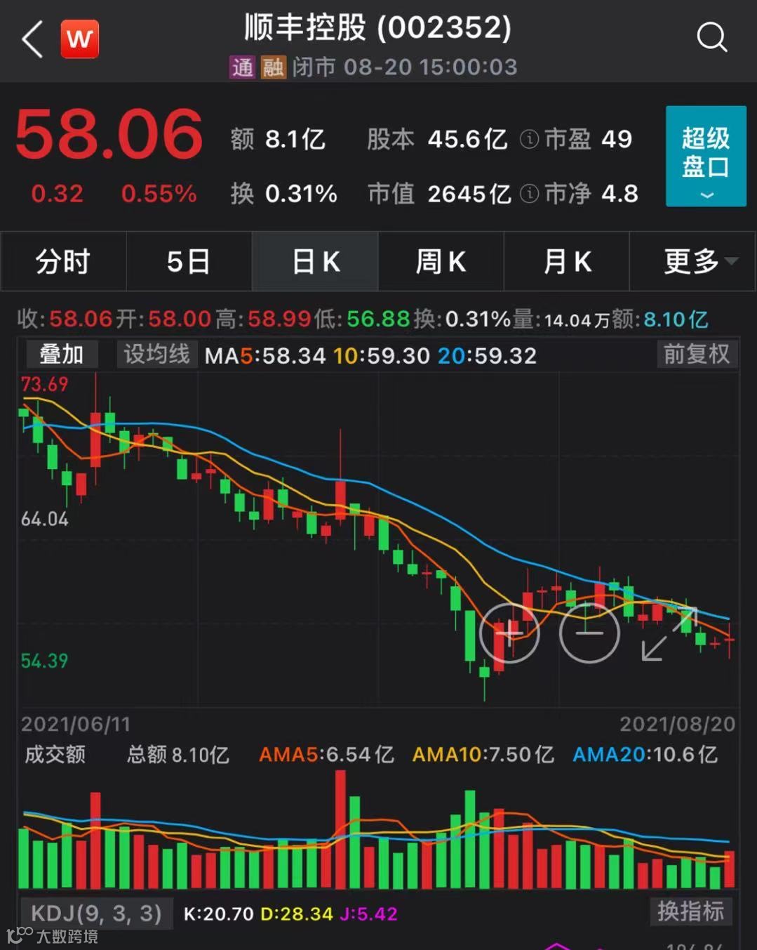 Wind数据显示,截至2021年8月20日,顺丰控股股价收报58.06元/股,较今年以来最高点腰斩,总市值蒸发超2600亿元。