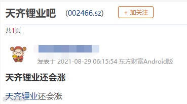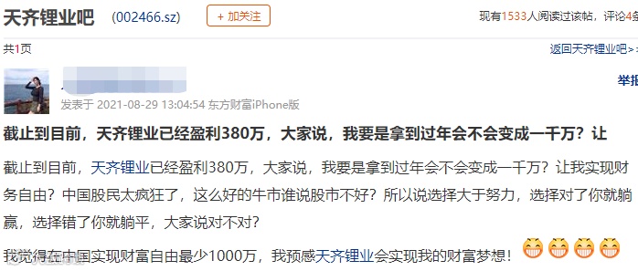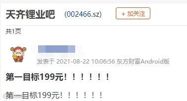 有凡尔赛的投资者表示:“截至目前,天齐锂业已经盈利380万元,我预感天齐锂业会实现我的财富梦想!”还有投资者表示:“天齐锂业还会涨。”“第一目标199元!”