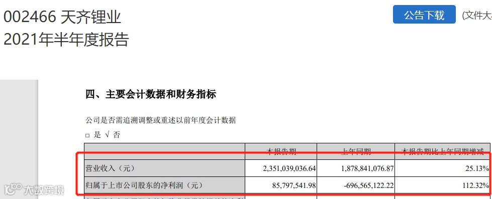 天齐锂业发布的半年报显示,公司上半年实现营业收入23.51亿元,同比增长25.13%;实现归属于上市公司股东的净利润8579.75万元,同比扭亏为盈,上年同期为亏损6.97亿元;基本每股收益0.06元。