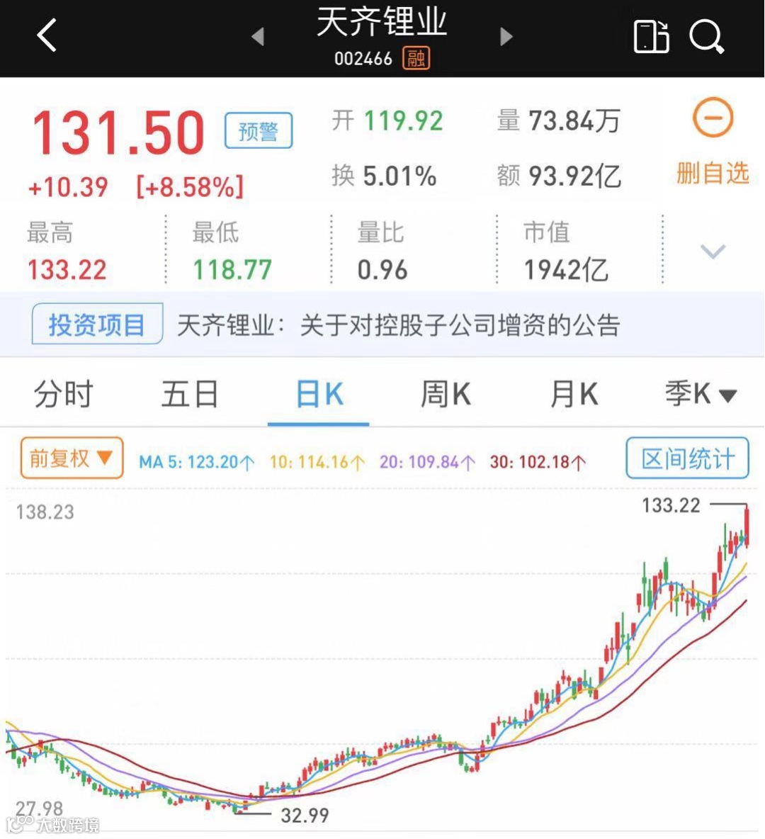 随着锂产业的景气度提升,天齐锂业的股价也是节节攀升。从4月12日的盘中最低32.99元/股到8月27日的盘中最高133.22元/股,4个多月的时间里,公司股价区间最大涨幅高达303.82%。