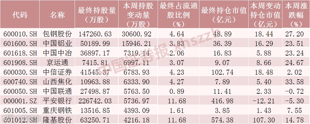本周北向资金持股增加数前十股