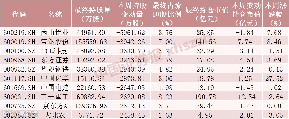 本周北向资金减仓股数前十股