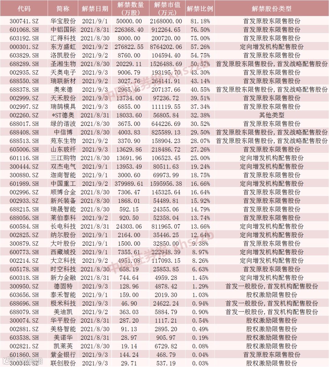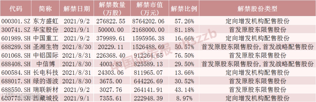 具体来看,Wind数据显示,东方盛虹9月2日将解禁27.68亿股,均为定向增发机构配售股份。华宝股份9月1日将解禁5亿股,均为首发原股东限售股份。中国重工9月2日将解禁38亿股,均为定向增发机构配售股份。圣湘生物8月30日将解禁2.02亿股,为首发原股东限售股份和首发战略配售股份。