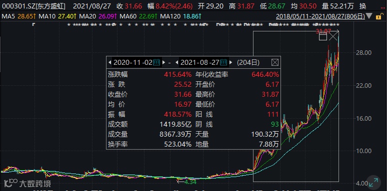 截至8月27日收盘,东方盛虹报31.66元/股,市值为1531亿元,下周解禁的股份占总股本的57.26%,解禁后流通盘将增加159.85%。东方盛虹也是光伏EVA树脂龙头股,去年11月2日以来累计上涨415.64%。