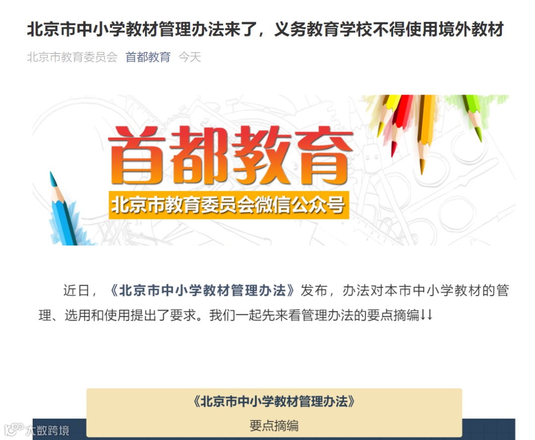 8月11日,北京市教育委员会官微披露,近日,《北京市中小学教材管理办法》(以下简称《办法》)发布,对本市中小学教材的管理、选用和使用提出了要求。明确义务教育学校不得使用境外教材。同时,严格控制地方课程教材和各级各类读本数量,对数量过多、质量不高的及时进行清理。