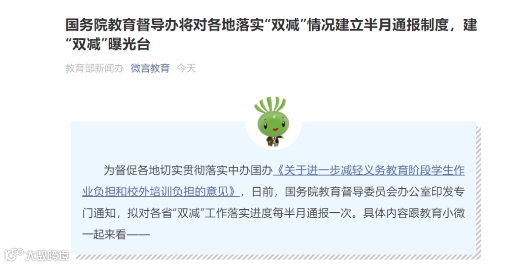 8月11日,教育部新闻办官微发文,为督促各地切实贯彻落实中办国办《关于进一步减轻义务教育阶段学生作业负担和校外培训负担的意见》,日前,国务院教育督导委员会办公室印发专门通知,拟对各省“双减”工作落实进度每半月通报一次。