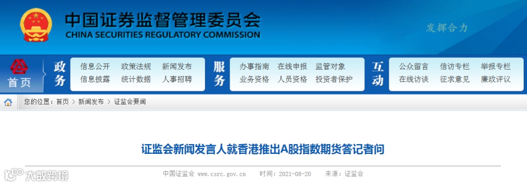 中国证监会新闻发言人8月20日表示,香港证监会宣布将在香港推出A股指数期货。中国证监会对香港推出A股指数期货表示支持,中国证监会认为此举有利于丰富境外投资者投资A股的风险管理工具,进一步吸引境外长期资金配置A股,巩固和维护香港国际金融中心地位。