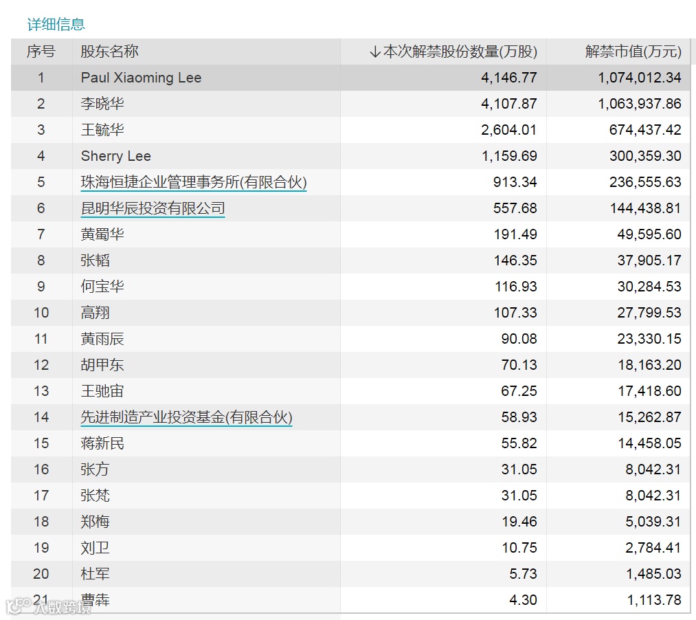 下周解禁市值最大的恩捷股份为锂电池隔膜龙头股,是近两年市场的大牛股之一。2020年以来,截至2021年8月13日,恩捷股份累计涨幅达到414.62%。8月16日解禁的2.46亿股来自于2018年8月完成的定增股份的一部分,彼时定增发行价为24.87元/股,发行对象为Paul Xiaoming Lee、李晓华、王毓华等21名股东。在下周解禁的2.46亿股中,Paul Xiaoming Lee将解禁4146.77万股,李晓华将解禁4107.87万股,这两大股东的解禁市值均超百亿元。Wind数据显示,截至2021年6月15日,Paul Xiaoming Lee、李晓华分别为恩捷股份第一和第五大股东。