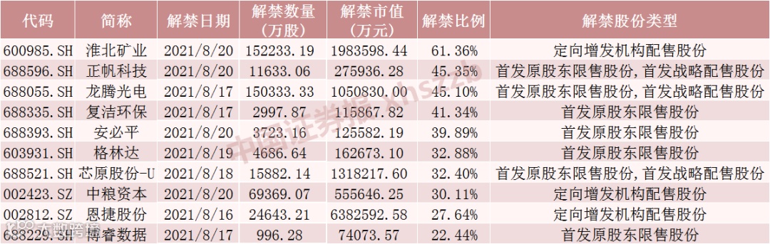 恩捷股份、淮北矿业、芯原股份-U、龙腾光电解禁金额将超100亿元,龙腾光电、芯原股份-U、正帆科技、复洁环保、安必平、淮北矿业、中粮资本、格林达、均瑶健康流通盘将增加超100%。