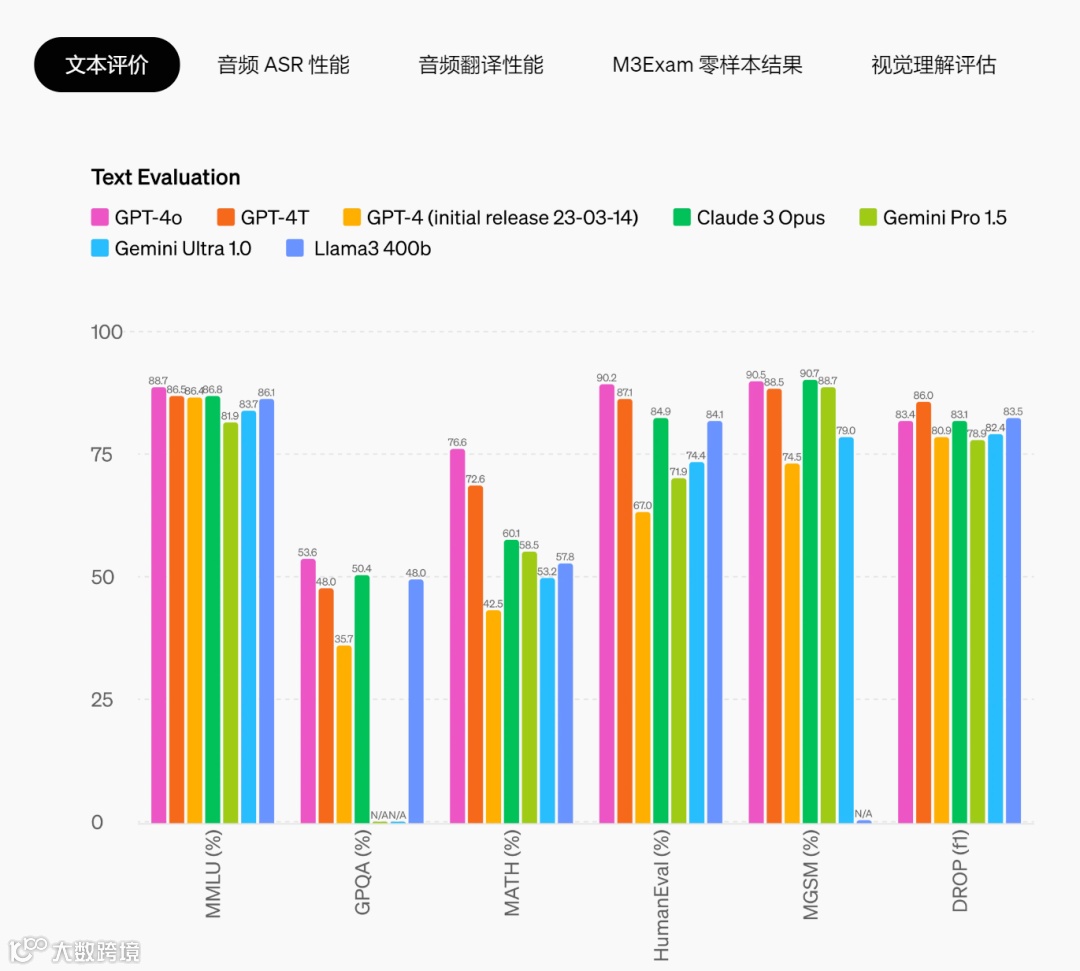 在文本处理方面,根据OpenAI发布的技术报告,GPT-4o在多个评测指标上都超越了之前的模型。无论是在语言理解(MMLU)、知识问答(GPQA)、数学问题解答(MATH),还是编程能力(HumanEval)上,GPT-4o都展现出了更强的性能。