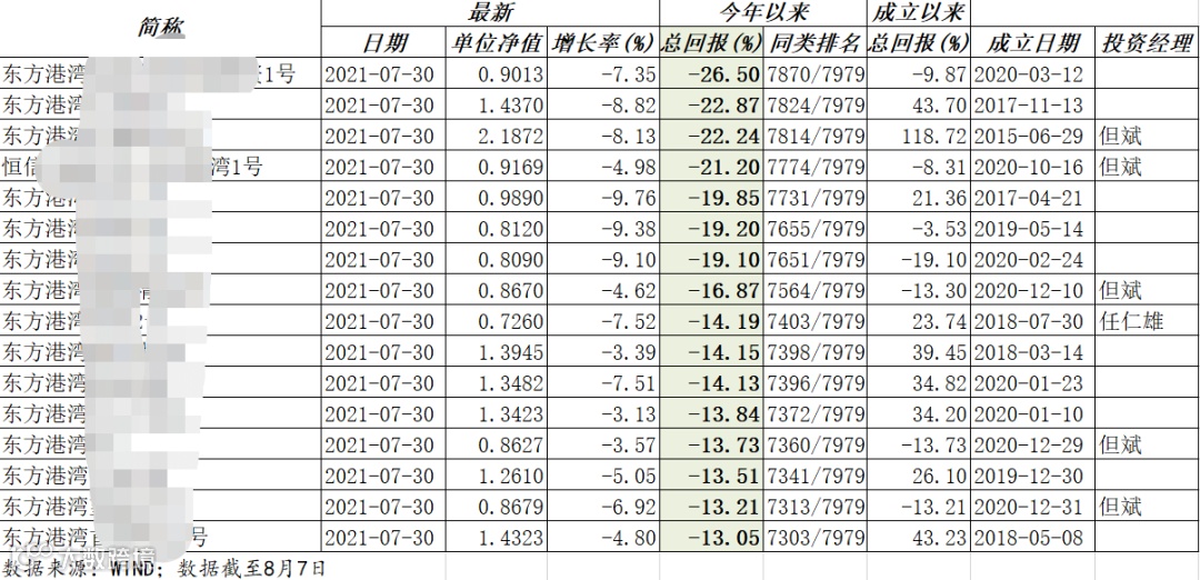 来自Wind的最新监测统计数据显示,截至8月7日,该机构共监测到213只深圳东方港湾投资管理股份有限公司管理的股票策略私募产品有最新净值公布;其中,在2021年1月1日前成立的147只私募产品中,共有多达133只产品2021年以来为负收益,占比超过九成。在此之中,年内亏损幅度超过10%的产品数量则达到35只,占比接近1/4;其中更有多只产品年内大亏逾20%,最差产品今年以来的亏损幅度达26.50%。不过需要指出的是,凭借过往几年公司对于贵州茅台等大市值白马股的坚定看好,东方港湾多只成立于2014年、2015年的老产品,截至目前也实现了300%的长期高额收益。