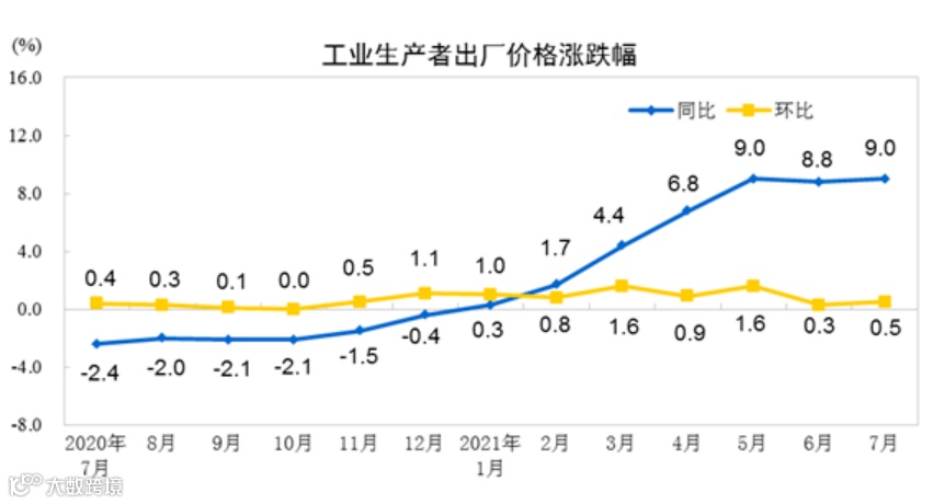 从同比看,7月PPI上涨9%,涨幅比上月扩大0.2个百分点。