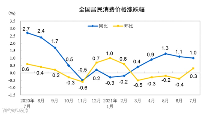 国家统计局8月9日发布数据显示,7月,全国居民消费价格(CPI)同比上涨1.0%,涨幅比上月回落0.1个百分点。CPI环比由上月下降0.4%转为上涨0.3%。