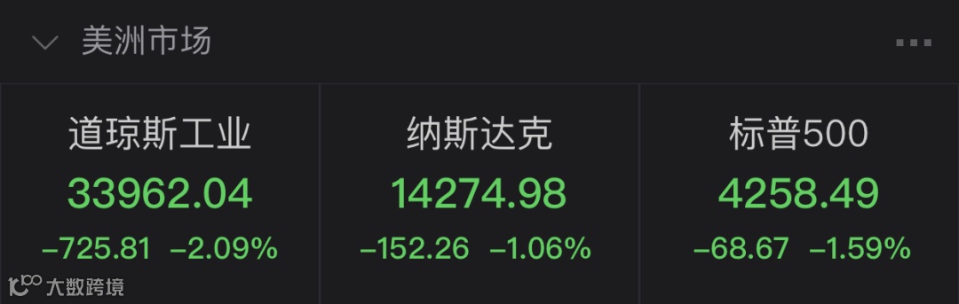美股市场中,三大指数全线大跌,道指创近9个月来最大跌幅。截至收盘,道指跌2.09%,报33962.04点;标普500指数跌1.59%,报4258.49点;纳指跌1.06%,报14274.98点。