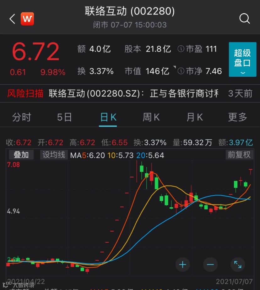 Wind数据显示,在美国当地时间6月30日、7月6日新蛋股价异动上涨后,联络互动也在随后的北京时间7月1日、7月7日分别收获涨停板。