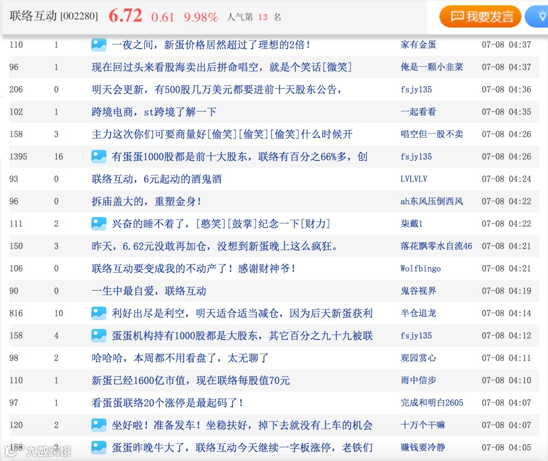 随着新蛋的暴涨,联络互动股吧内一片沸腾。直到凌晨都有不少人发帖、回帖,股吧人气冲到了全站第13名。