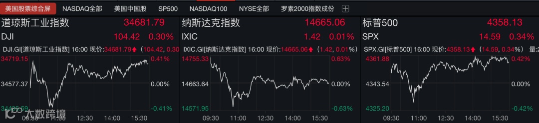 当日,美股三大指数盘初小幅调整后拉升,随后窄幅震荡。截至收盘,道指涨0.30%,报34681.79点;标普500指数涨0.34%,报4358.13点;纳指涨0.01%,报14665.06点。标普500指数、纳指创收盘历史新高。