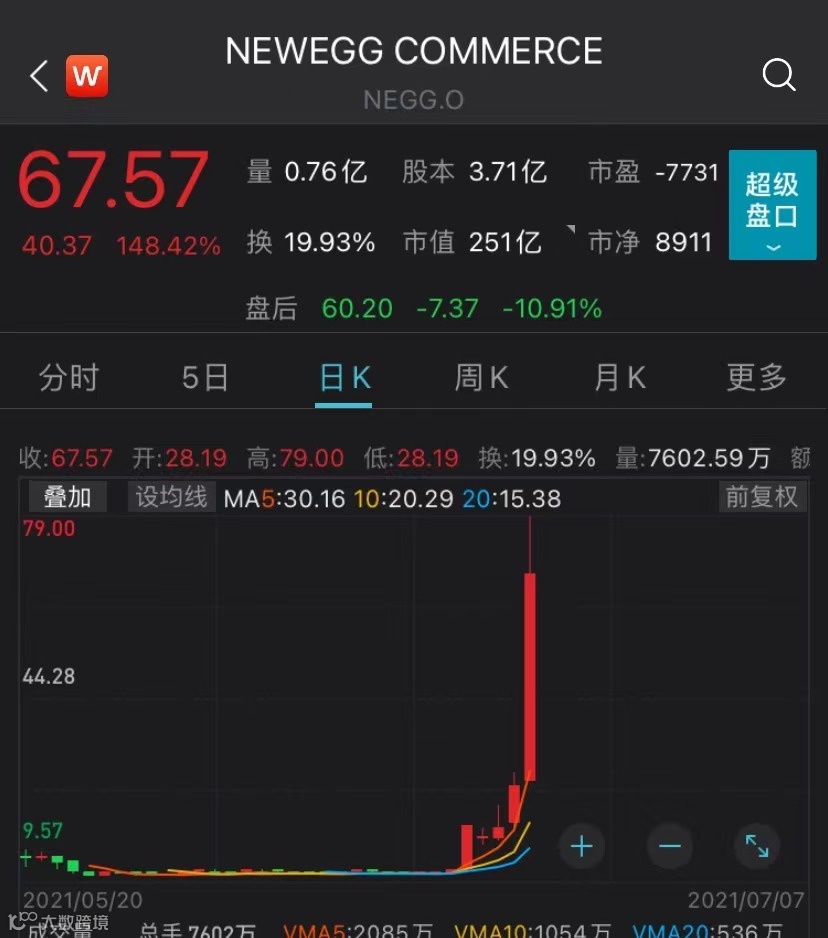 据Wind数据,当地时间7月7日,新蛋(Newegg Commerce,股票代码:NEGG)高开后持续拉升,盘中数次熔断,一度涨逾190%,收盘时涨幅为148.42%。