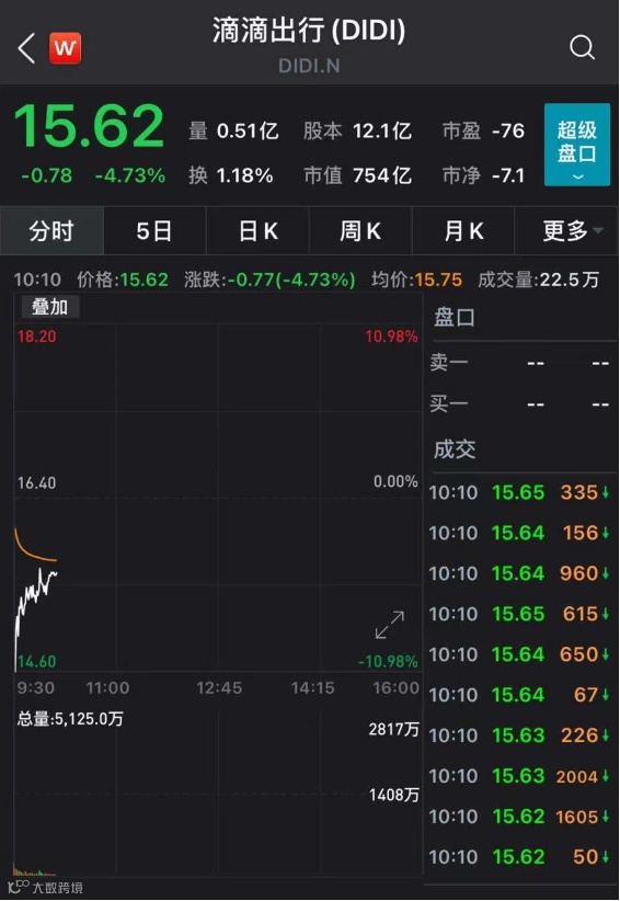 受此消息影响,Wind数据显示,滴滴出行美股开盘跌幅达10.98%,截至北京时间22:10,跌幅收缩至4.73%。
