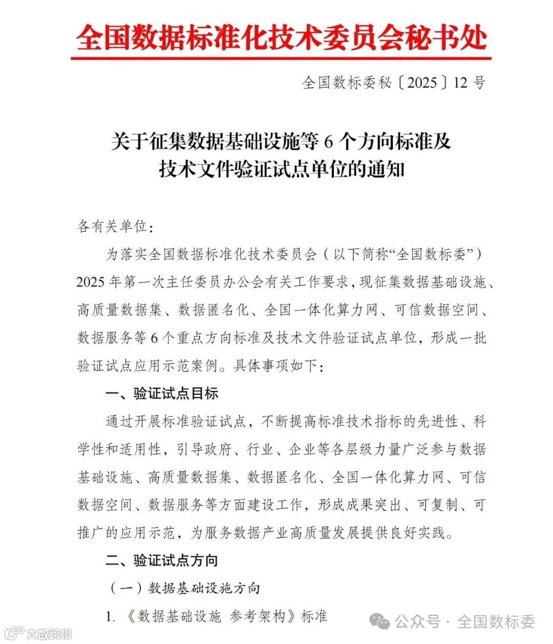 为落实全国数据标准化技术委员会(以下简称“全国数标委”)2025年第一次主任委员办公会有关工作要求,现征集数据基础设施、高质量数据集、数据匿名化、全国一体化算力网、可信数据空间、数据服务等6个重点方向标准及技术文件验证试点单位,形成一批验证试点应用示范案例。具体事项如下: