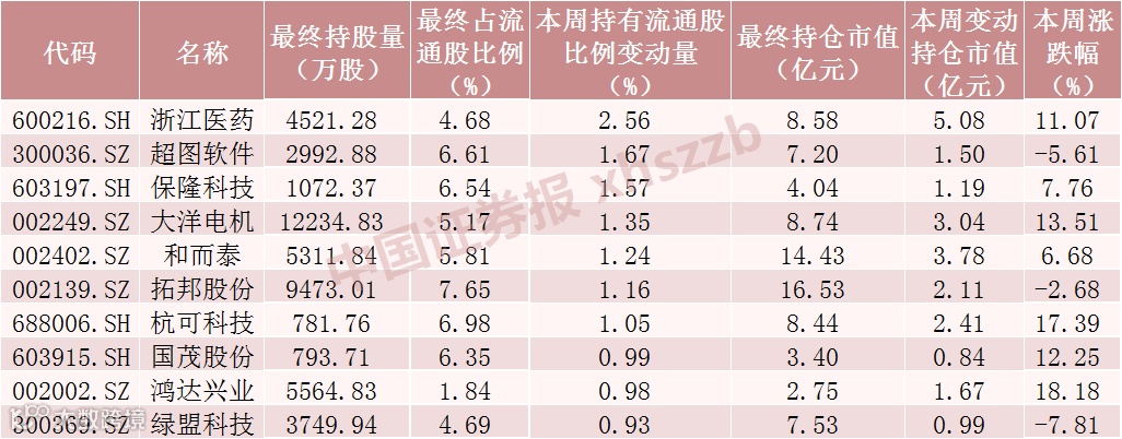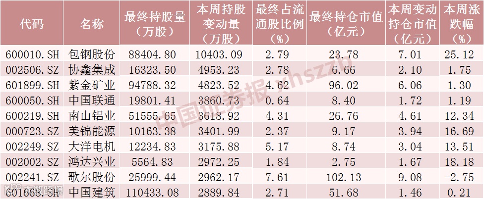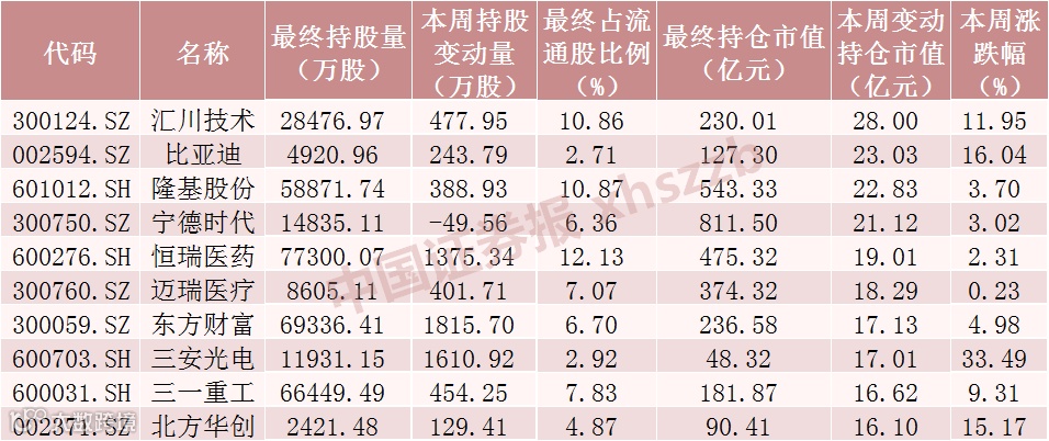 本周北向资金持股增加数前十股
