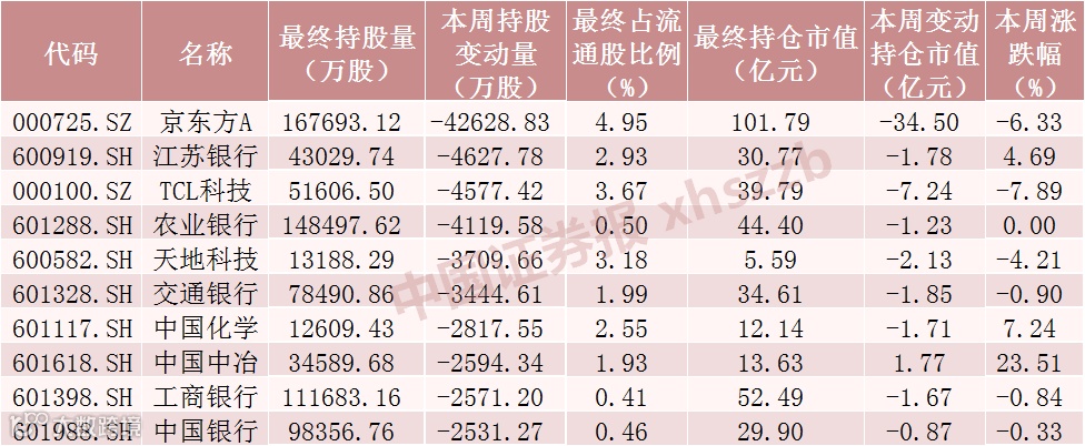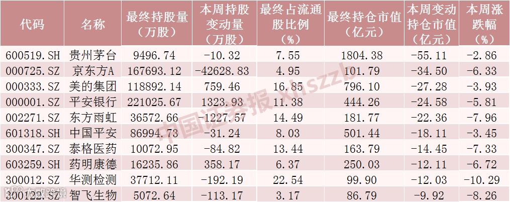 本周北向资金持仓市值减少额前十股