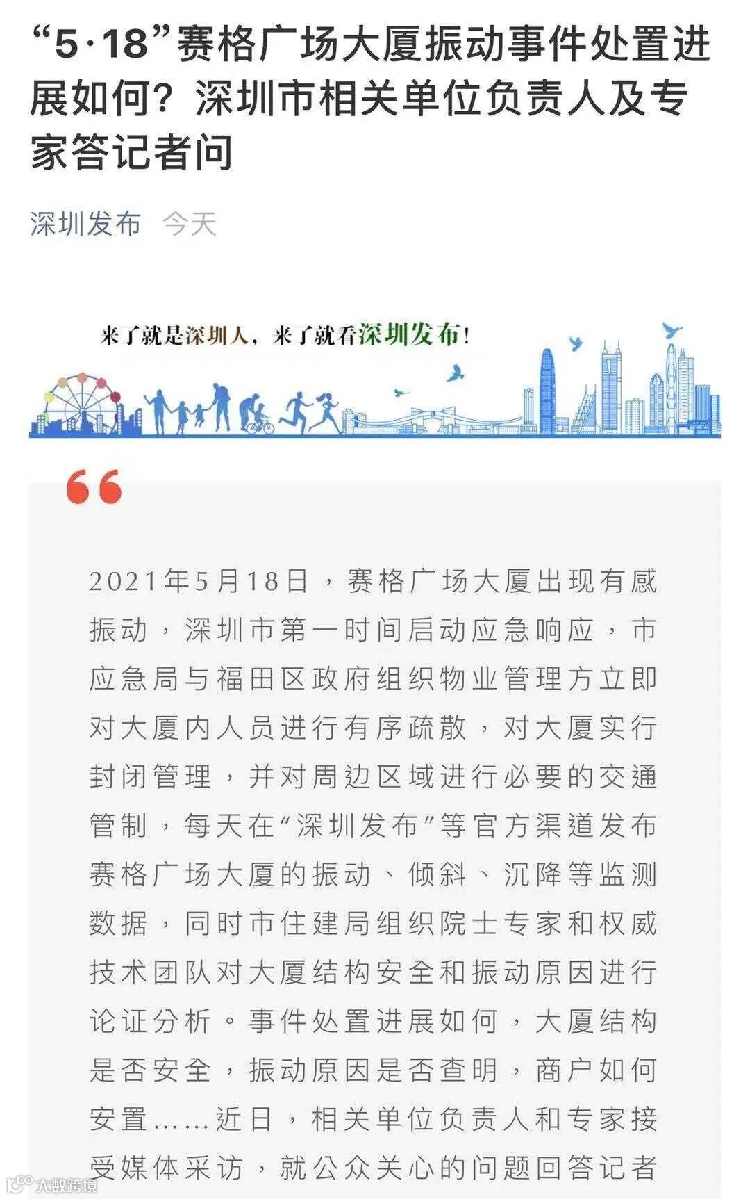 7月15日,“深圳发布”官微披露赛格广场大厦振动事件处置进展。专家组意见显示,桅杆风致涡激共振和大厦及桅杆动力特性改变的耦合,造成了赛格广场大厦的有感振动。通过大量检测、监测、试验和分析论证,并经多方复核、鉴定,赛格广场大厦在设计荷载范围内和正常使用情况下主体结构是安全的,可继续使用。