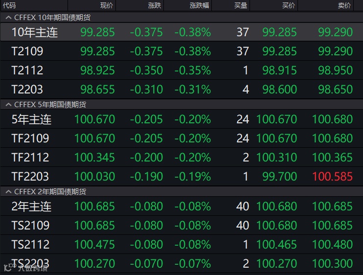 国债期货多数下跌,10年期主力合约大跌0.38%,脱离近1年高位。