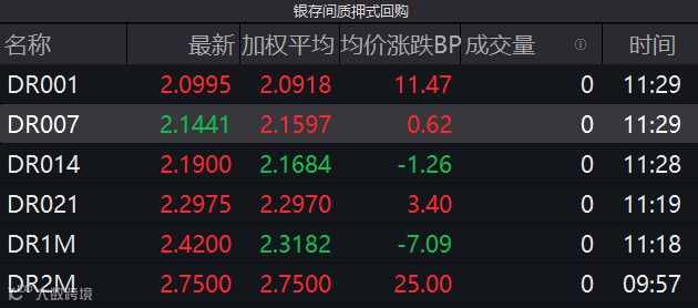 截至11:30,DR001加权平均利率上行约11BP至2.09%,DR007加权平均利率上行约1BP至2.16%。