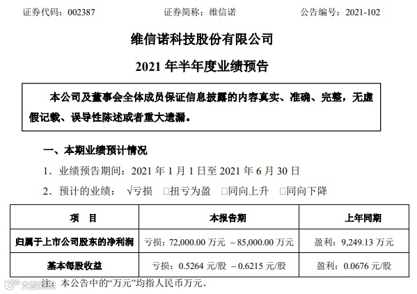 7月14日晚间,维信诺发布半年度业绩预告,预计上半年亏损7.2亿元-8.5亿元,上年同期为盈利9249.13万元。