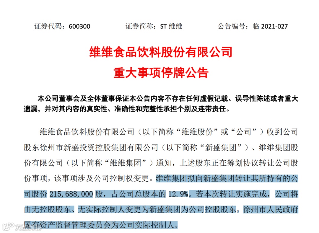 7月8日晚间,ST维维公告,股东维维集团拟向新盛集团转让公司12.9%股份,若本次转让实施完成,公司将由无控股股东、无实际控制人变更为新盛集团为公司控股股东、徐州市国资委为公司实际控制人。股票7月9日开市起连续停牌两个交易日。