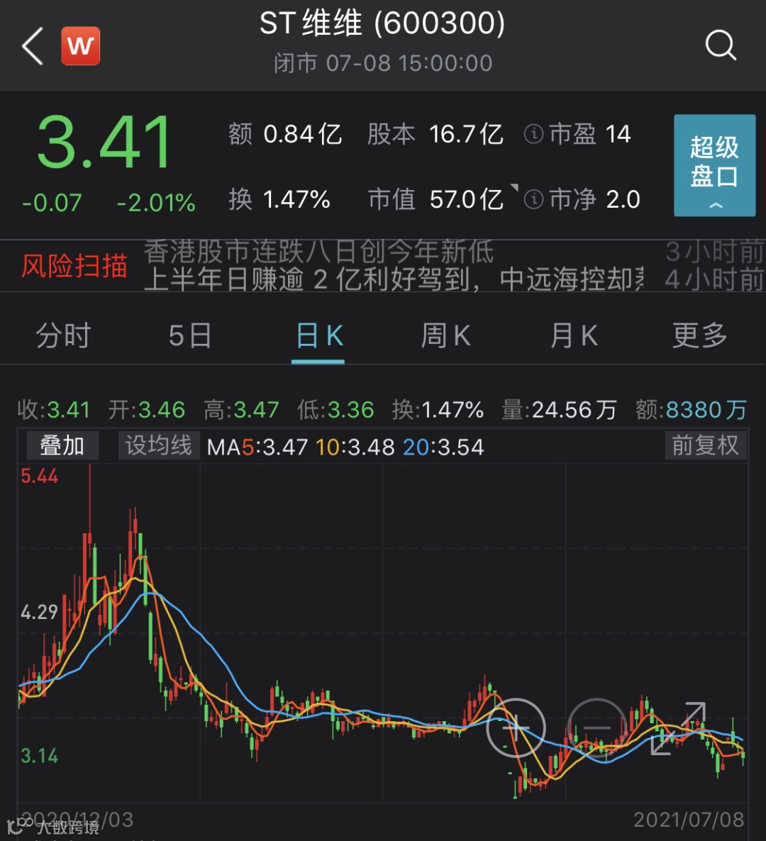 Wind数据显示,2021年以来ST维维盘面跌幅为25.67%,2月28日为阶段性低点,股价一度下探至2.33元/股,截至7月8日收盘,ST维维股价报收3.41元/股。