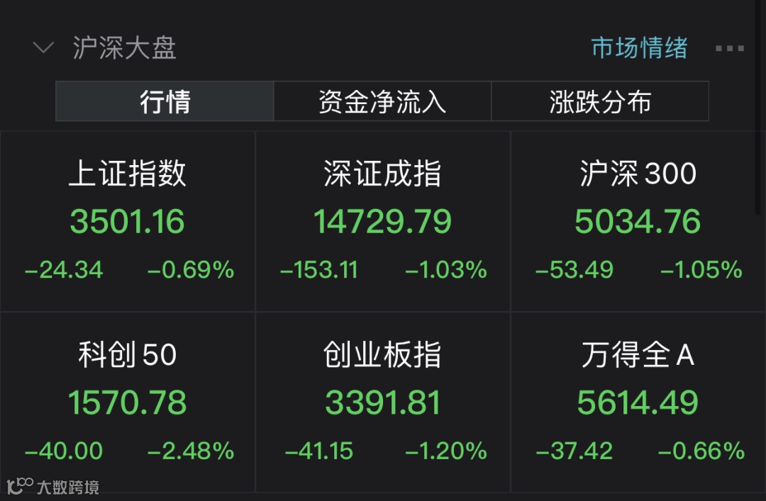 今日早盘,A股主要指数下跌,三大指数于10:15反弹,呈现接近“V”型的走势。截至午间收盘,上证指数跌0.69%,报3501.16点;深证成指跌1.03%,报14729.79点;创业板指跌1.20%,报3391.81点。