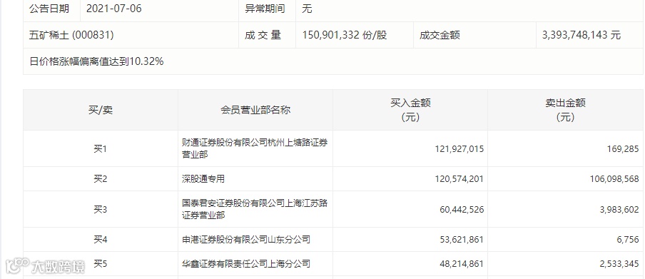 五矿稀土龙虎榜数据显示,7月6日,财通证券杭州上塘路营业部、深股通专用、国泰君安上海江苏路营业部、华鑫证券上海分公司分别买入12192.7万元、12057.42万元、6044.25万元、4821.49万元。其中,国泰君安上海江苏路营业部被市场认为疑似游资“章盟主”的常用席位。