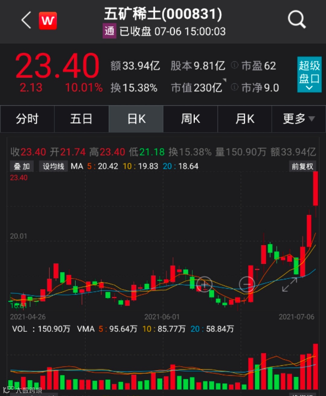 先买永磁,再炒稀土?7月6日,五矿稀土领涨稀土板块,尾盘快速拉升涨停,封单9.43万手。