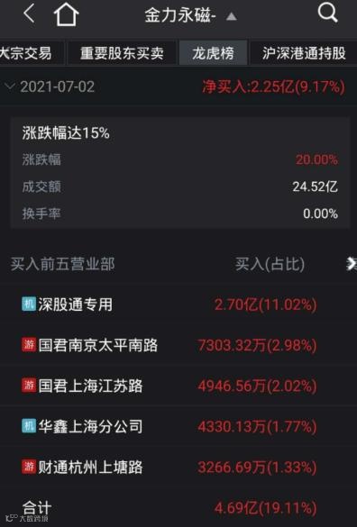 龙虎榜数据显示,疑似知名游资“章盟主”常用席位等4路资金“杀入”。有趣的是,7月2日金力永磁大涨“20cm”,这4路资金也位列买入的前五位。
