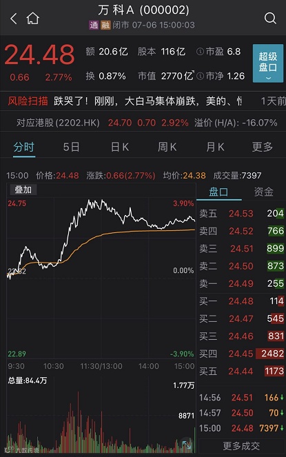与高估值赛道股大跌对应的是,中国平安、万科A等低估值价值股逆市上涨。其中万科A上涨2.77%,报24.48元。
