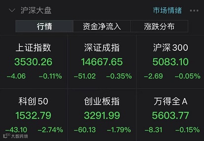7月6日,A股市场宽幅震荡。沪指一度跌超1%,收盘仅下跌0.11%,报3530.26点;深证成指下跌0.35%,报14667.65点;创业板指走势较弱,盘中最多跌超3%,收盘下跌1.79%,报3291.99点。