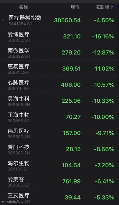 部分今日跌幅居前医疗器械股