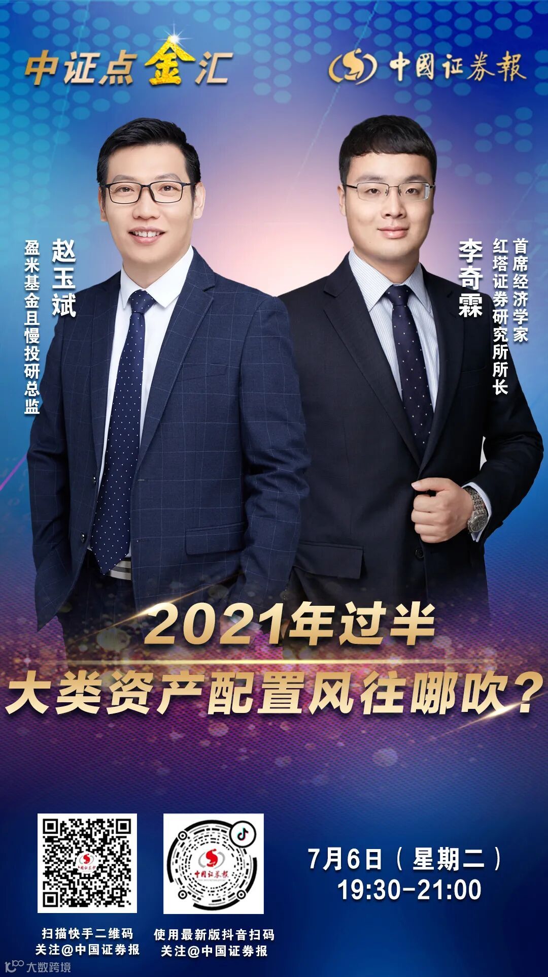 7月6日(周二)晚7点半,盈米基金且慢投研总监赵玉斌,以及红塔证券研究所所长、首席经济学家李奇霖将做客中证报“中证点金汇”,围绕“2021年过半,大类资产配置风往哪吹?”为你在线答疑解惑。