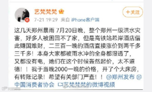 7月21日,因暴雨滞留在郑州的一名旅客发文称,7月20日晚郑州高铁站希岸酒店涨价到近三千元一晚,而平时价格为二三百元一晚。这种哄抬物价的行为,立刻引发公愤。