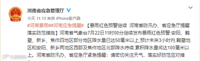 河南省气象台7月22日11时00分继续发布暴雨红色预警:安阳、鹤壁、新乡、焦作四地部分地区降水量已达50毫米以上,预计未来3小时内,鹤壁地区和安阳、新乡两地区西部及焦作地区北部降水持续,累积降水量将达100毫米以上。