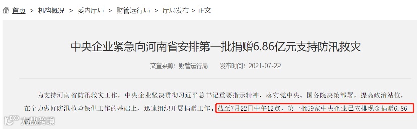 为支持河南省防汛救灾工作,中央企业在全力做好防汛抢险保供工作的基础上,迅速组织开展捐赠工作。截至7月22日中午12时,第一批59家中央企业已安排现金捐赠6.86亿元。