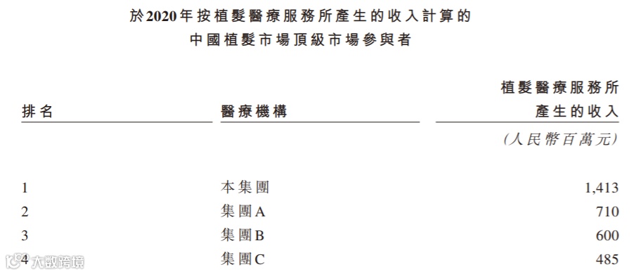 雍禾医疗披露,其在中国50个城市经营51家医疗机构,是中国最大的专门从事一站式毛发医疗服务的企业。根据全球著名企业咨询公司弗若斯特沙利文的数据,在中国所有毛发医疗服务提供商中,按各种主要财务和运营指标计算, 包括2020年的总收入、2020年末的注册医生人数、2020年末运营中医疗机构数量以及2020年的就诊植发患者人数,雍禾医疗均排名第一,远超行业其他对手。