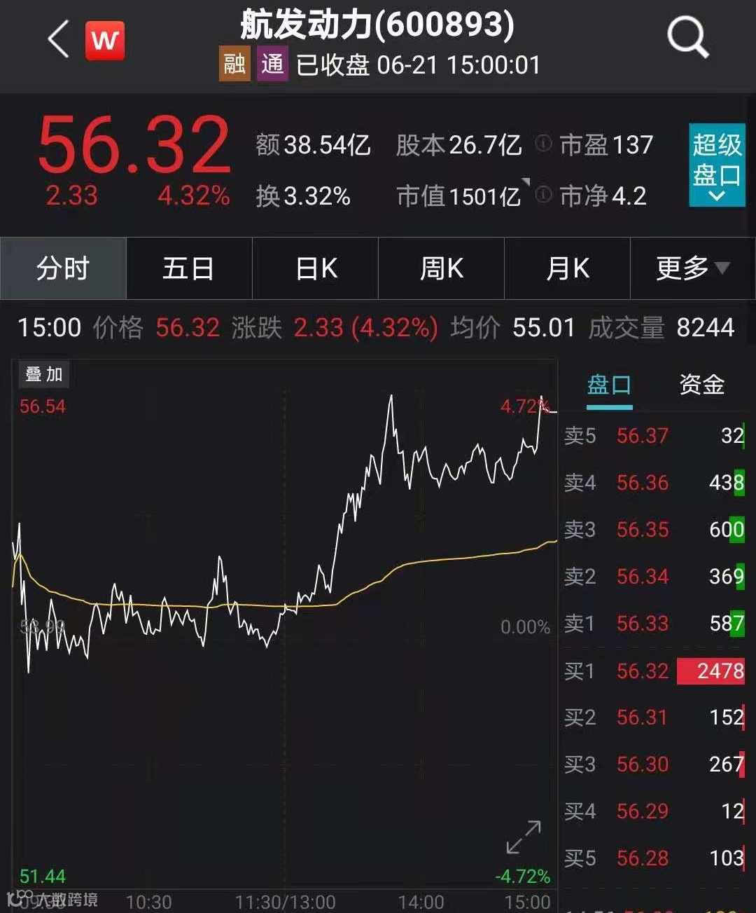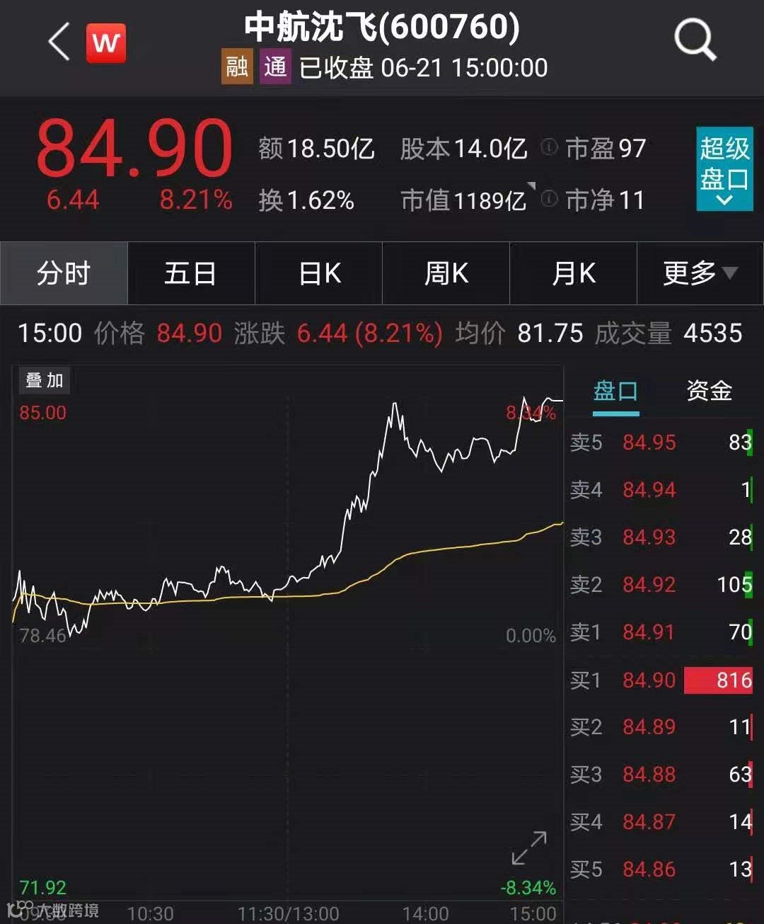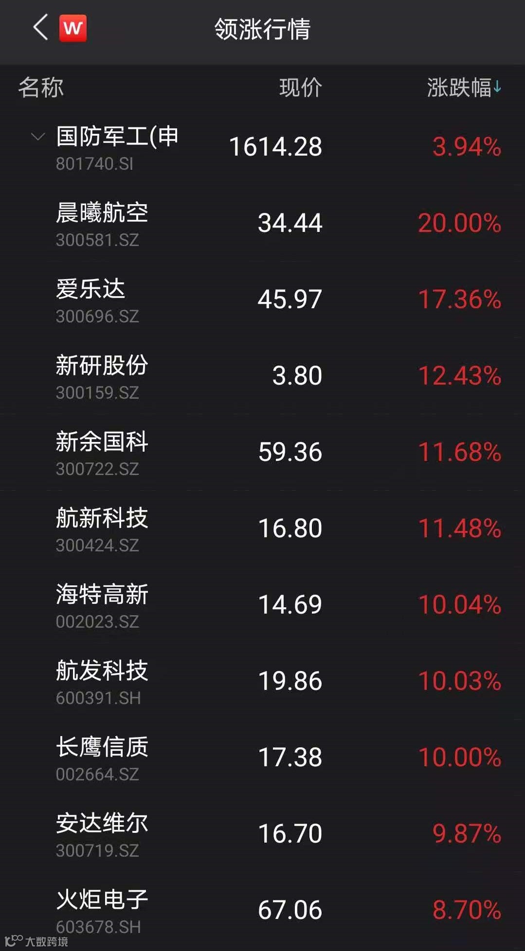 千亿市值的国防军工龙头中航沈飞今日大涨8.21%,公司A股总市值升至近1200亿元,近5个交易日累计涨逾12%。另一只千亿市值龙头航发动力今日收涨4.32%,公司A股总市值突破1500亿元。